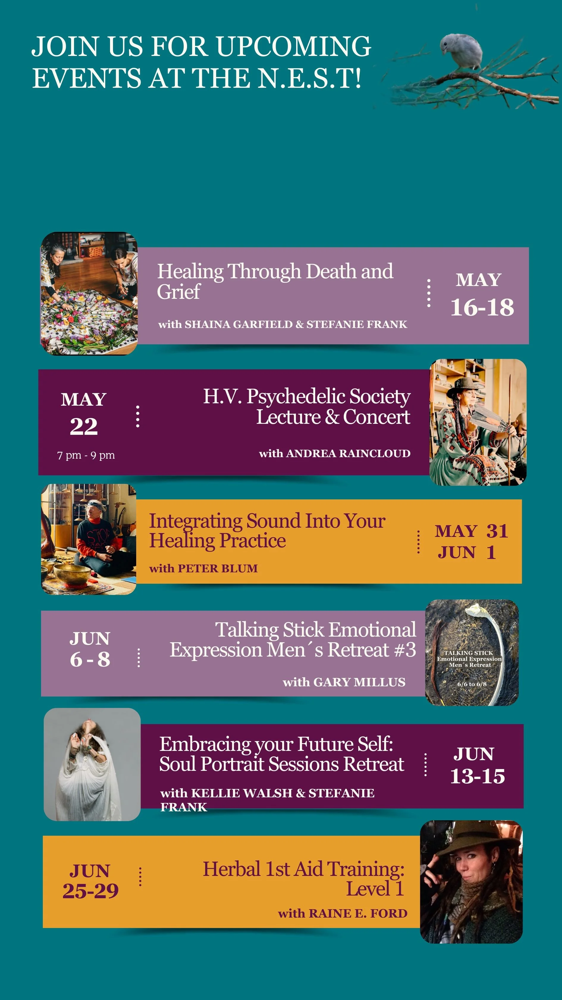 Within this newsletter you shall discover the whispers of what lies ahead this month. Yet, remember that the full tapestry awaits you in the loom of our website's calendar. Explore, flutter and soar, and should your wings seek a private roost or a collaborative voyage, know that I stand ready and eager to guide you.