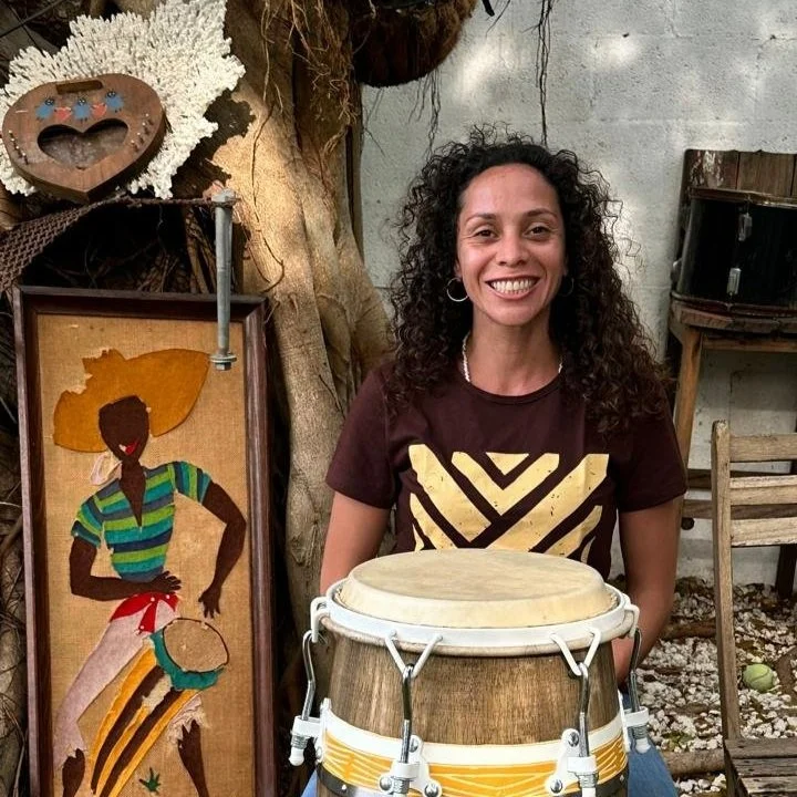 Camila Vasquez, the daughter of Babalorixá Adolfo Pxanticosusque, was born into the Umbanda tradition at the Umbanda Temple of São Sebastião in Brazil. From a young age, she studied to be a Curimbeira, playing a vital role in ceremonies by playing the Atabaque drum, a sacred devotional instrument for the Orisha divinities.